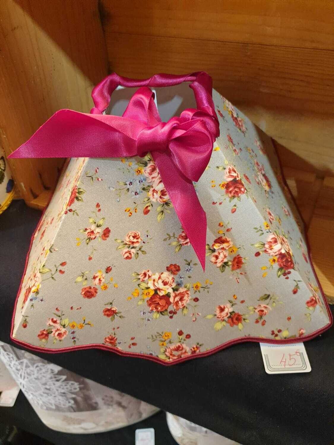 Abat-jour pyramide carrée à bord découpé, en coton liberty gris imprimé de bouquets de fleurs roses et bordeaux, avec un fin galon bordeaux de 3 mm(soutache) qui court sur le bord bas, et un ruban de satin bordeaux avec une jolie boucle, en haut.